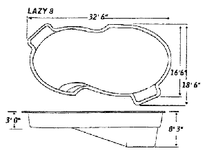 The Lazy 8 adds impressive beauty of form to any home. With distinct curves and "love seats" for two on each end of the pool, your own backyard comfort zones for two can take you away from the stress of the day. With side entry stairs and bench, there is lots of room for laps and exercise in the Lazy 8. A convenience ledge starts at the end of the shallow end and continues completely around the diving well to join once again at the opposite shallow end wall. The Lazy 8 is diving ready for a six (6) foot diving board. How do you have a lazy day of fun and leisure? In the Model Lazy 8 of course! |