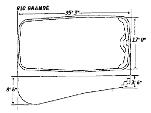 The Rio Grande is annually one of Sundown Pool's most popular size family swimming pools. It has the capacity to easily accommodate about 20 people, making it perfect for those backyard get-togethers. The 35-foot length allows the serious swimmer to get through a workout with ease. The Rio Grande is larger than the national average size for an in ground pool. It ranges in depth from 3½ to 8½ feet, which allows ample depth for diving. At the shallow end of the pool are three steps for easy access, and a love seat that spans the width of the pool. The decking around the Rio Grande is as flexible as your imagination. It can include redwood, concrete, tile, or just about anything you desire shaped to produce a dramatic effect in your yard. With the Rio Grande you know you are getting the maximum in swimming pool fun. |