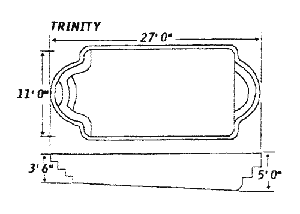 The Trinity is one of Sundown Pools most stylish designs, with long slender lines and gentle curves that lend a feeling of standing in the shadows of the acropolis in ancient Greece. The Trinity's Grecian design makes it not only stylish but also practical for small yards and patio homes. This Sundown Pool has a depth of 3 feet to 5 feet, and is 12 feet wide by 28 feet in length. The Trinity is one of Sundown Pool's all time most popular designs, with plenty of both depth and length to allow the swimmer in the family ample room for exercise. The shallow end not only contains the three steps entering the Trinity, but also a long love seat to simply relax in. The deep end has a swimout to which hydrotherapy jets can be easily installed. Choose any decking imaginable to turn your backyard into a Grecian courtyard with the Trinity from Sundown Pools. |